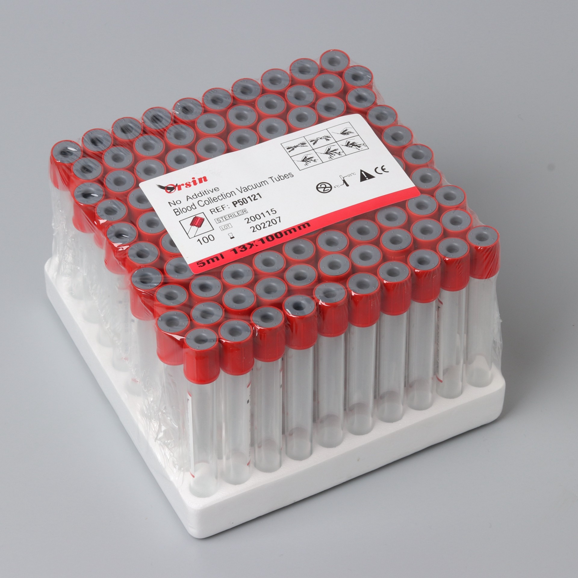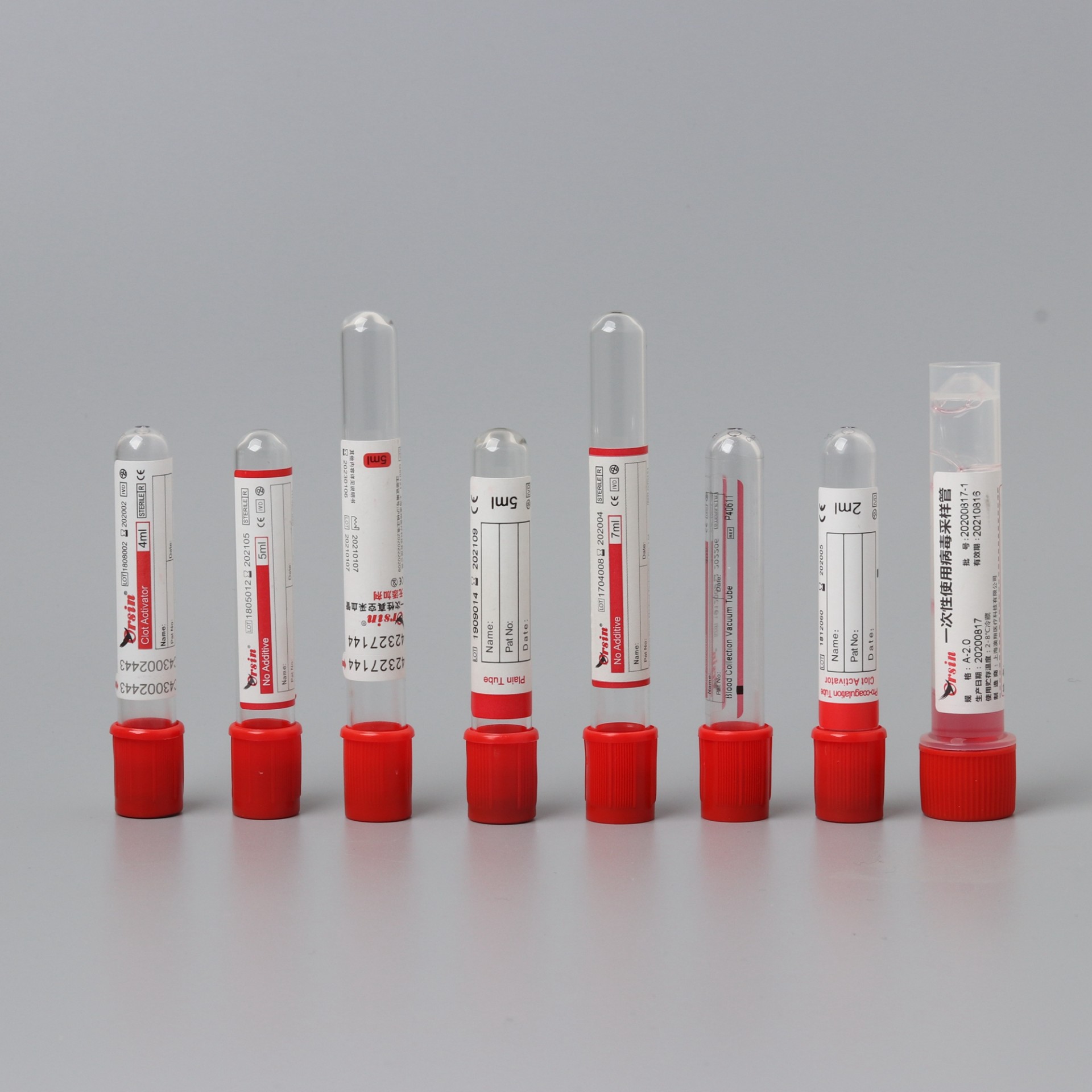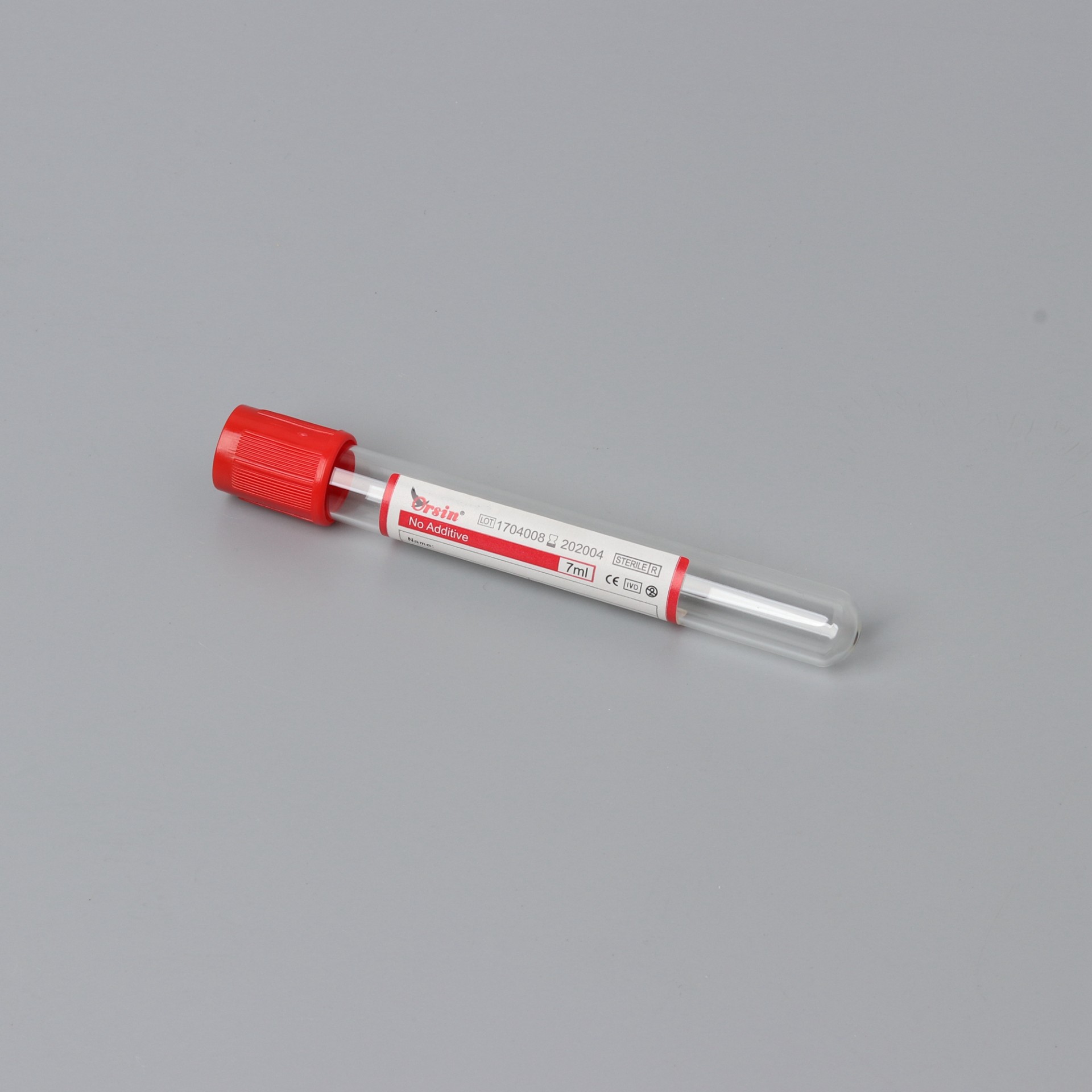 红色安全头盖指示此类采血管在试管内没有添加任何添加剂,用于血清生化,血库和血清学相关检验。Orsin真空采血管进行了特殊工艺处理,无论是玻璃管还是塑料管,其内壁能有效避免血细胞附壁,最大限度减少标本体外溶血。使检测结果更加准确。 Red cap tubes, with red safety caps to indicate this type of blood collection tubes not containing any additive in the test tube, are used in serum biochemistry, blood banks and serology related tests. Processed with special treatment, Orsin vacuum blood collection tubes, either glass or plastic, can effectively avoid blood cell attached on its inner wall and reduce the in vitro hemolysis of specimen to the greatest extent, so as to guarantee more accurate test result.